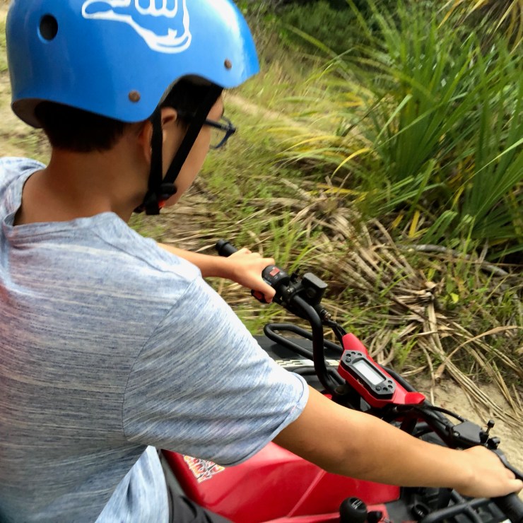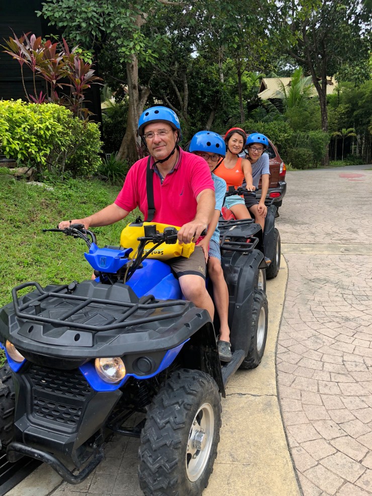 Taaras and couple of other resorts on the beach have a lot to offer. We tried Yoga, which was fun, but Felix is not convinced it is thing for him as the basic stretching is already tiring him out. Martin and I would go to the gym then play beach tennis where our competitive streaks surfaced all over again. 3 days ago, we decided to ride the Quad. Oh boy, this thing is completely different from what I thought it would do… The guide took us into the jungle near the beach. The “roads” are very narrow with plenty of rocks and bumps plus low hanging branches. The steering wheel is heavy and brakes, even harder to squeeze. The engine under the seat heated up our bums like buns in an oven. The ride has been slow and bumpy, but we got quite a bit of adrenalin whenever there came a steep hill or a sharp curve. It was actually fun, especially when Martin took over the driving position on our Quad. For someone who has never had any driving experience, I am impressed how well he manoeuvred (intentionally went through the muddy puddles I particularly said no to). He later told me his driving skills benefited from computer games that he had played…well, there is a plus side for the countless wasted hours on gaming, I suppose.