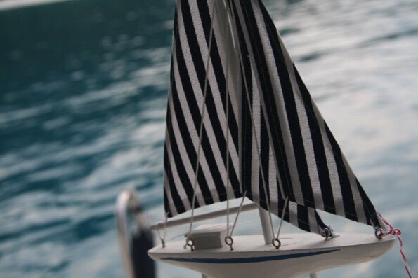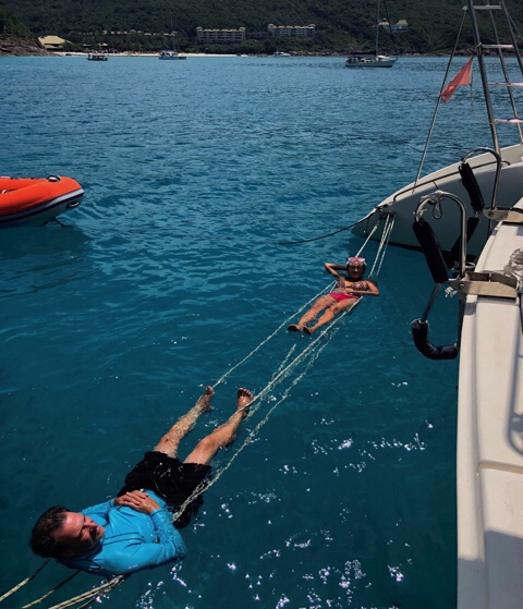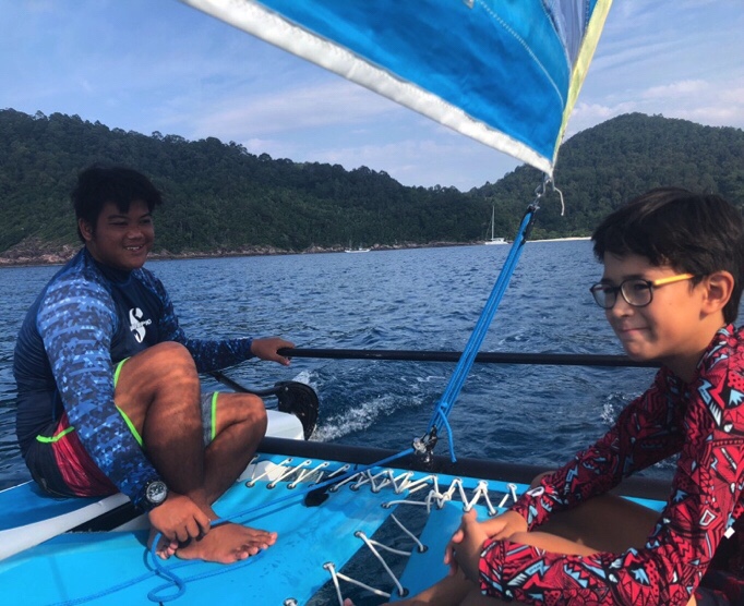 Sailing through the islands, we are excited to see what surprise holds around each corner. The boys are watching the rock islands and try to see the shapes they take on… a dinosaur, a bun, a whale, a pooping turtle… We found a beautifully protected spot and decided to anchor there for the night. The water was milky green and inviting. We all jumped in the water and swam around the boat. Felix challenged Martin to get on the boat by climbing the anchor ropes. After all, that’s how it is done in the movies… Believe or not, after a few practice tries, Martin actually made it and climbed successfully on the boat. With the sun going down, we toasted him being officially a qualified Pirate! Then Felix made lamb racks on the BBQ while we watched 2 fisherman’s boats skilfully catching fishes. It felt like we were in another world. By nightfall, we were the only boat anchored there. A short thunderstorm came and went. Then the bright full moon lit up the sky! We stepped on the deck and watched the islands and mountains around us. “The moon is like a giant touch light.”said Martin. The whole magical atmosphere brought us back to why we started the trip and how it was like in the early days in Redang. After a round of family games, we all went to bed early and slept with the moonshine through the hatches. Next morning it was just the start of another beautiful sunny day. We saw a crab float on a leaf in the sea. A beautiful little bird landed on our front deck and spent a good few minutes cleaning his colour feathers. Felix and Martin went back into the water to practice more pirate climbing skills while Michael and I tidied up the boat. Then anchor was up and off we went.
